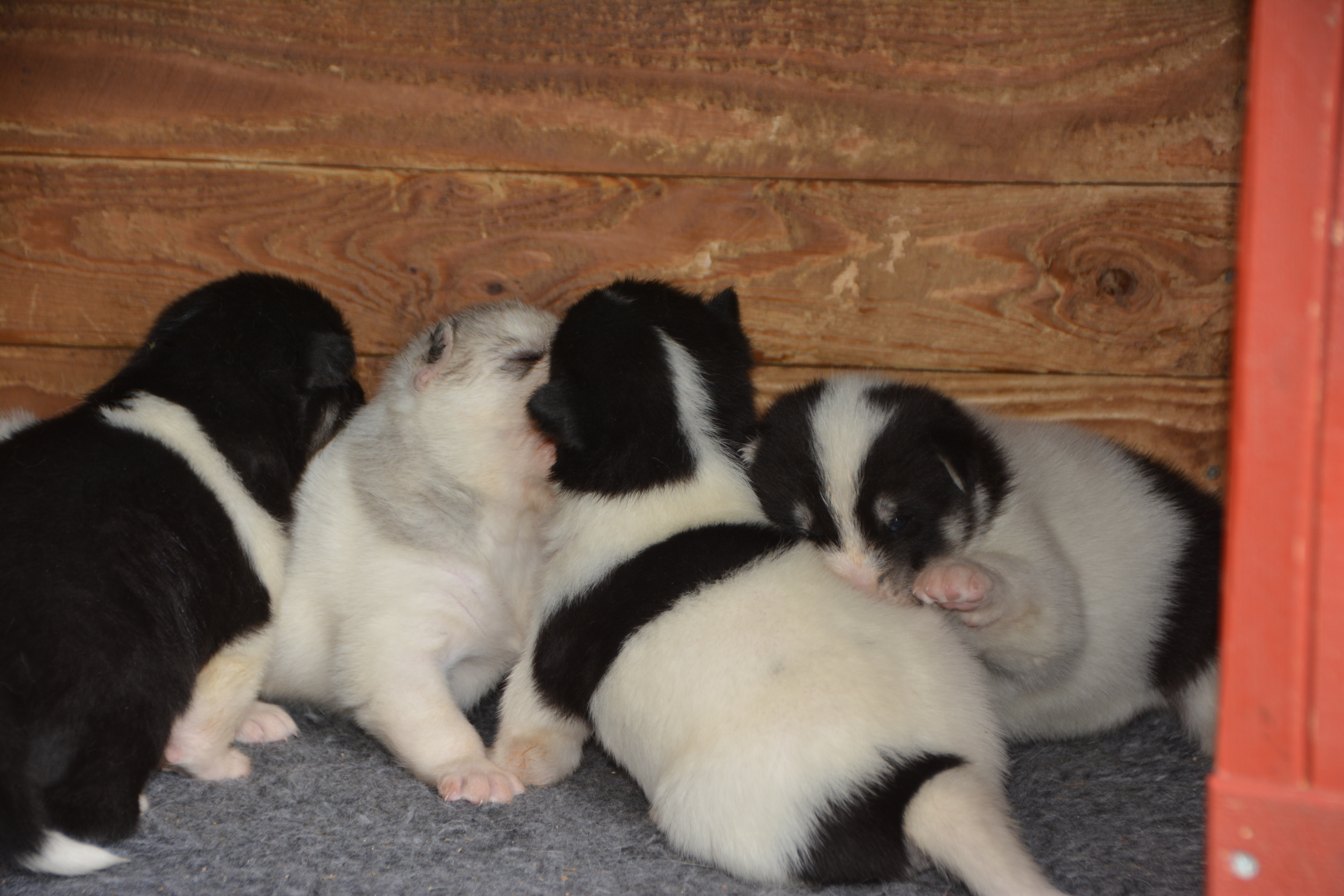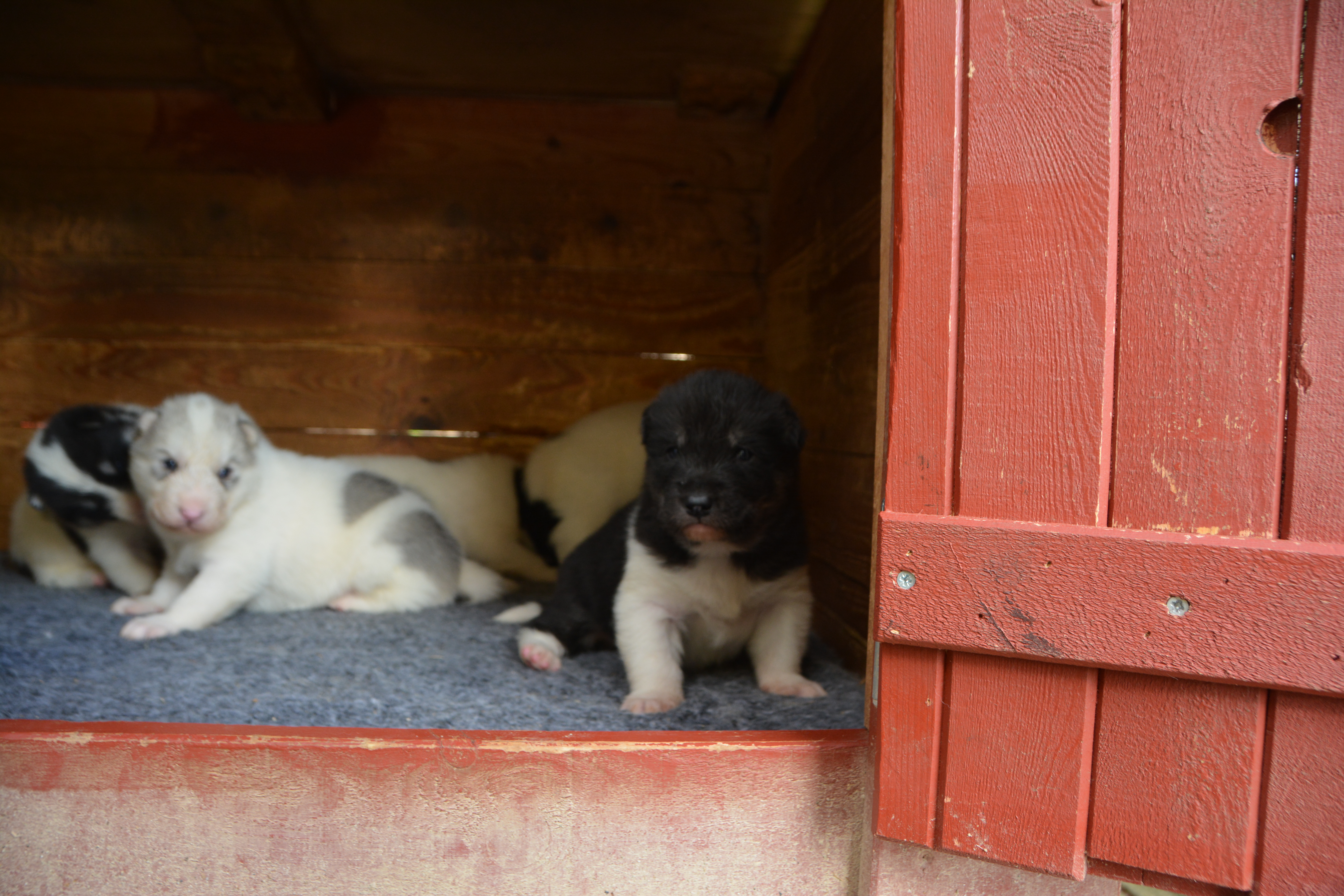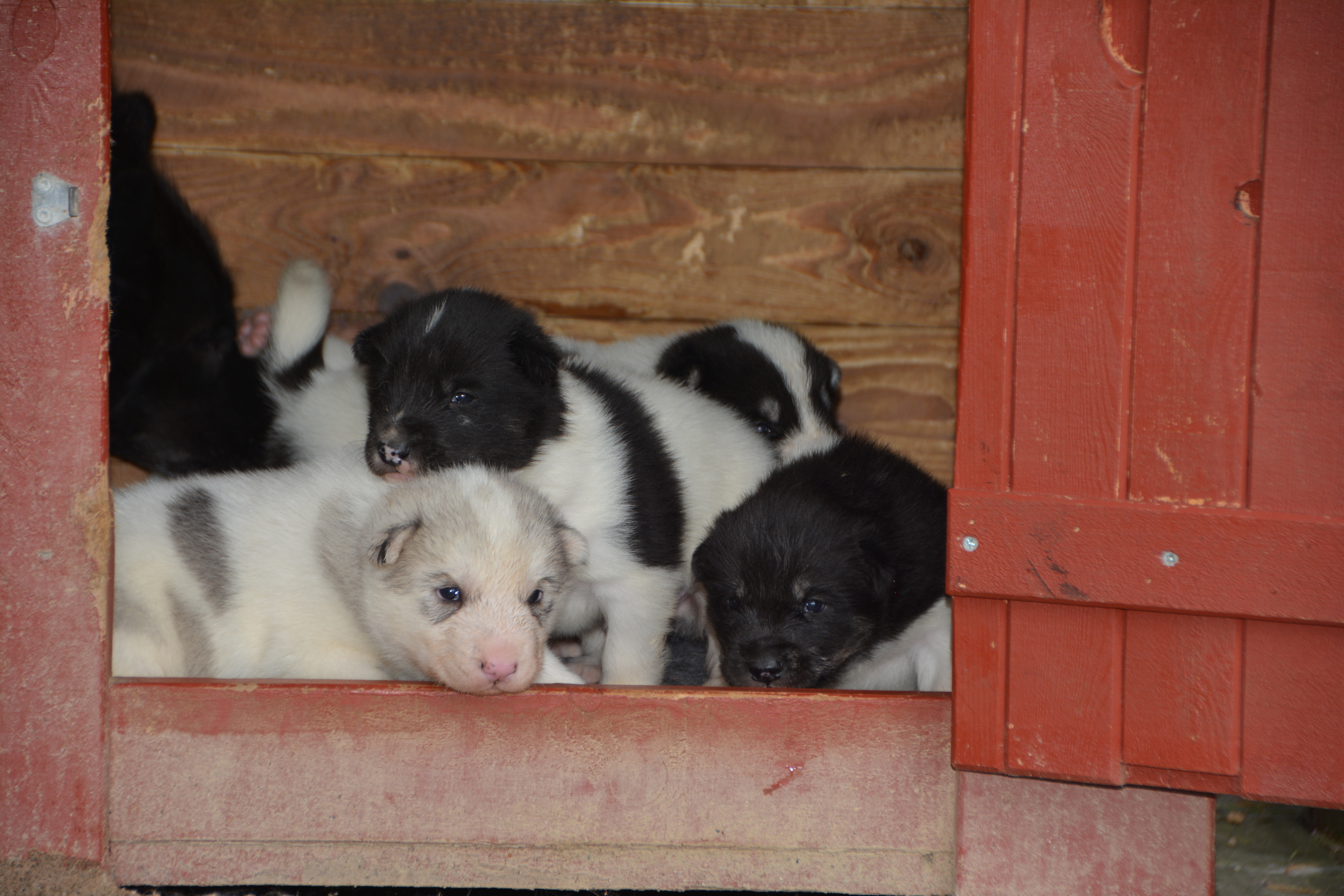 Livet går ellers fortsatt mest med til spising og soving, men nå også litt forsiktig lek valpene i mellom.