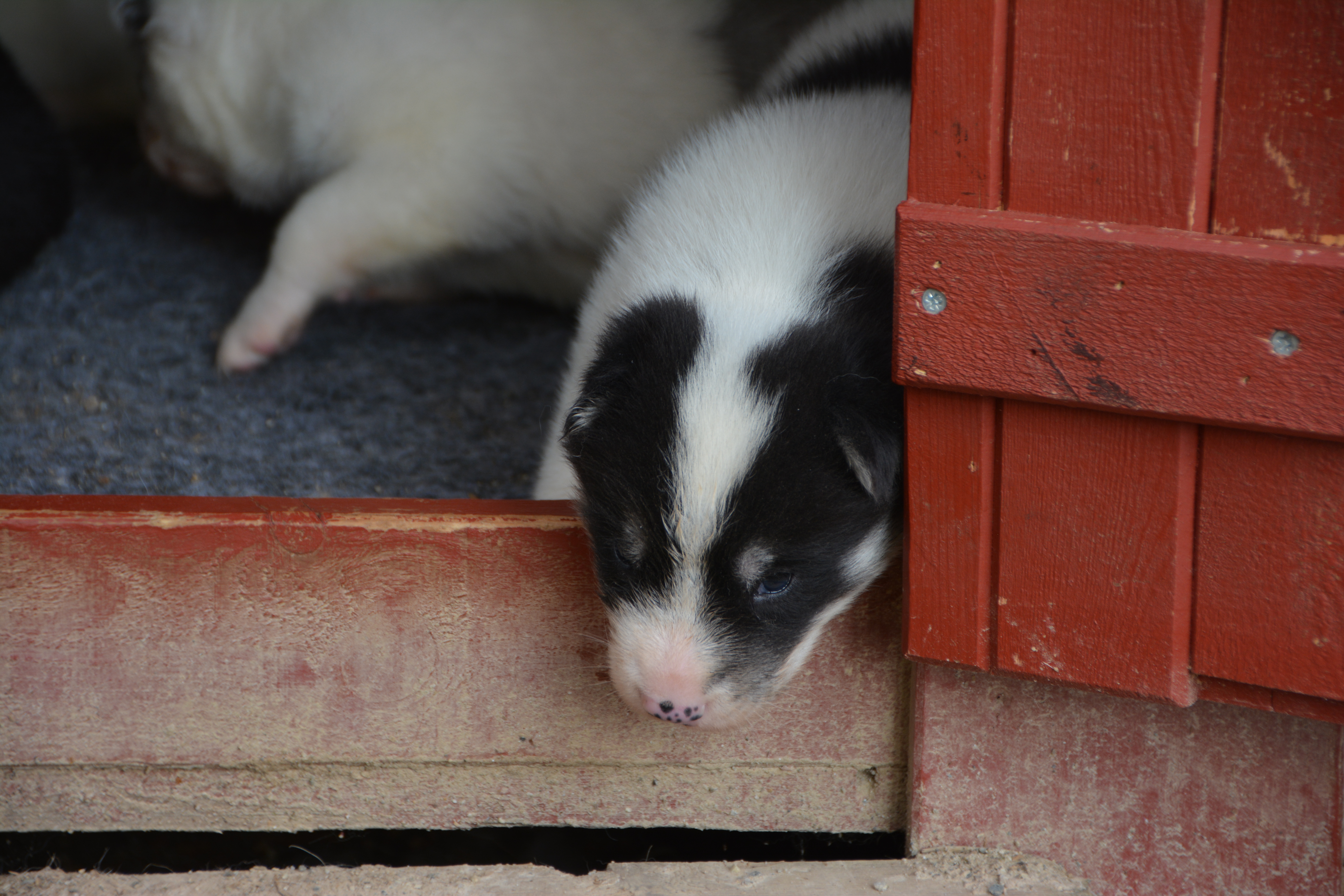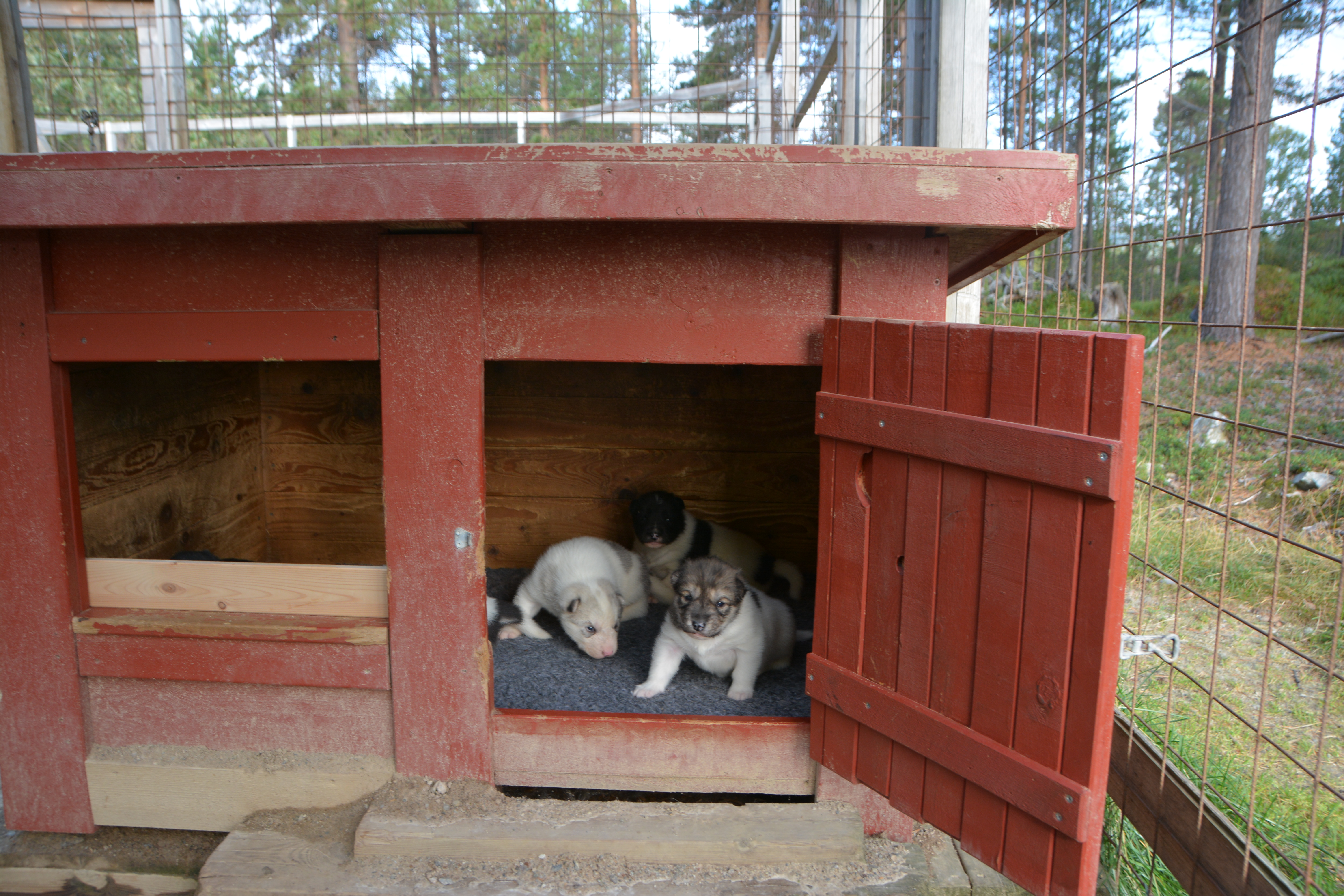 Valpene nærmer seg tre uker og har begynt å oppdage at det er en stor, stor verden utenfor det lune valpehuset. Det har vært en mild og forholdsvis tørr helg, så da er det fint å åpne den store døren på huset og la dem få kikke litt på den store verden der ute.