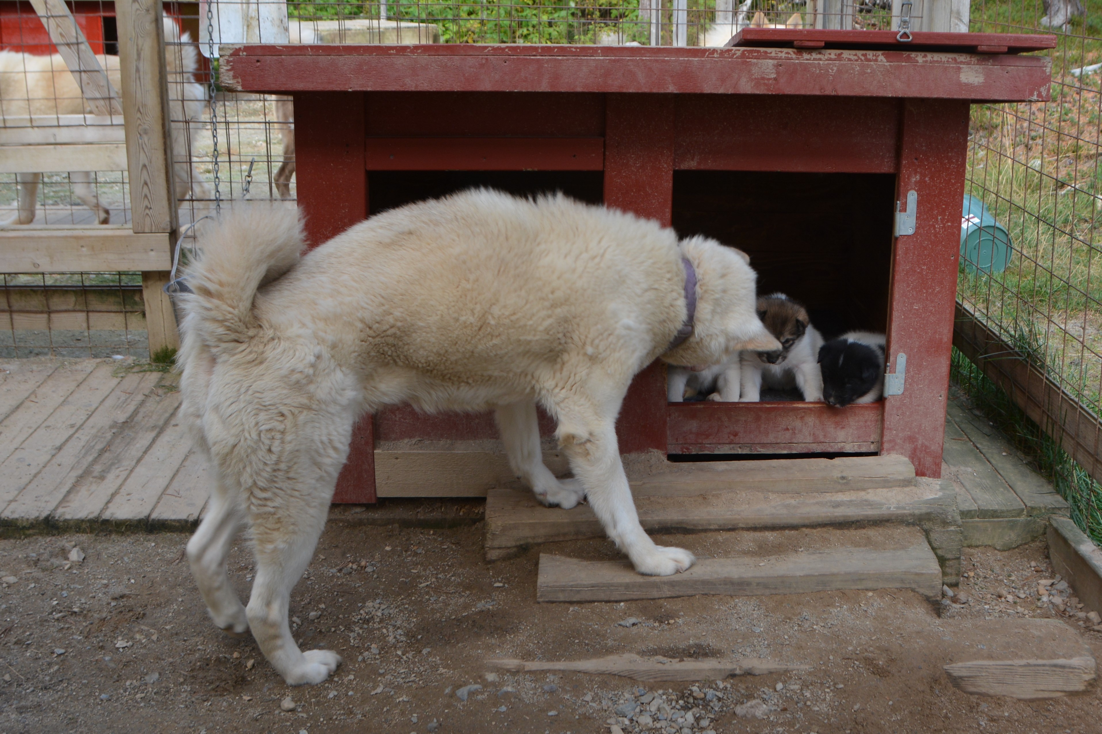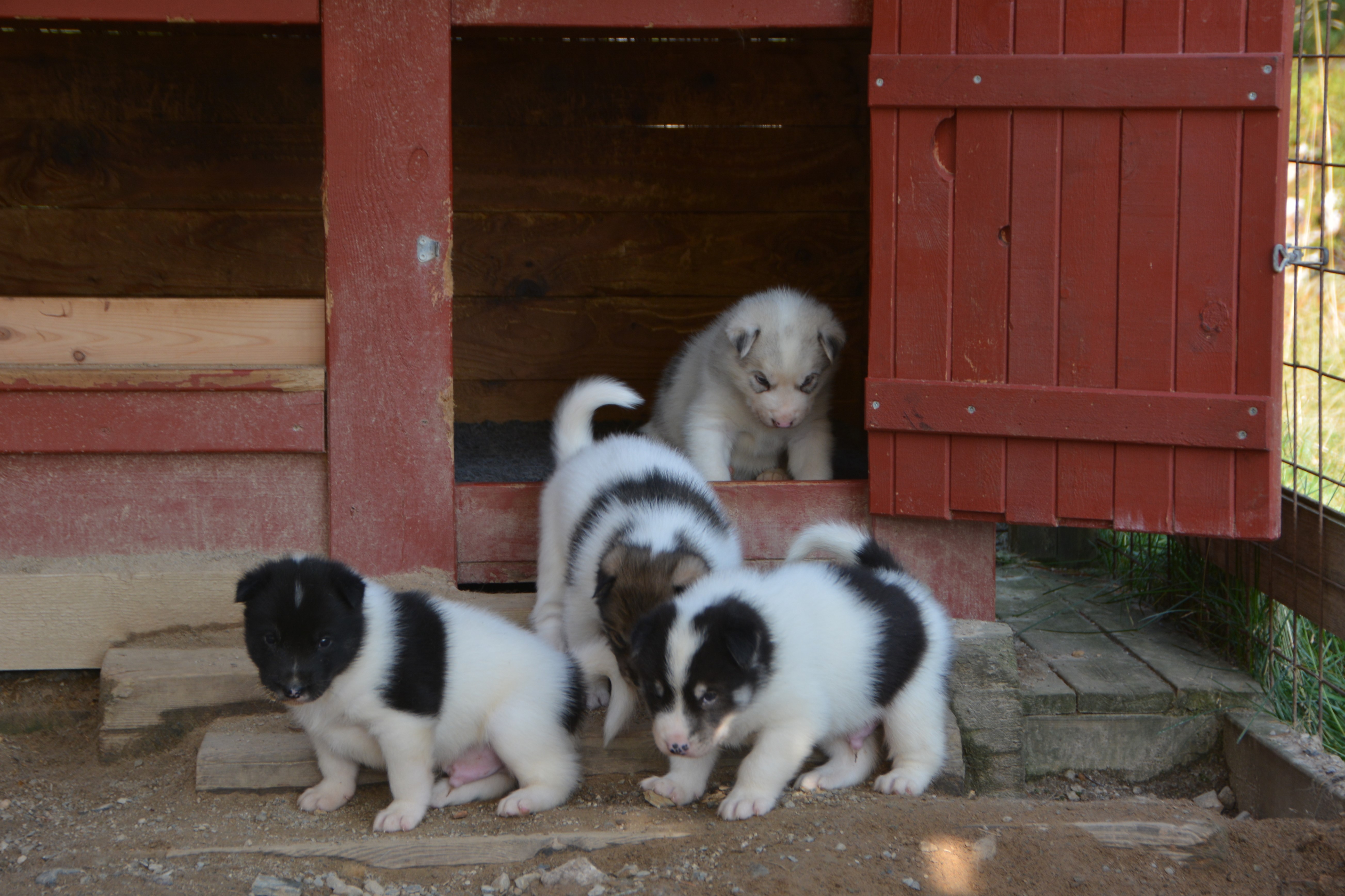 Valpene har akkurat passert tre og en halv uke, og de kommer seg ut og inn av hundehuset på egne ben. Lett! Eller nesten lett da. I dag var tiden inne til å få hilse på noen av de andre i flokken.