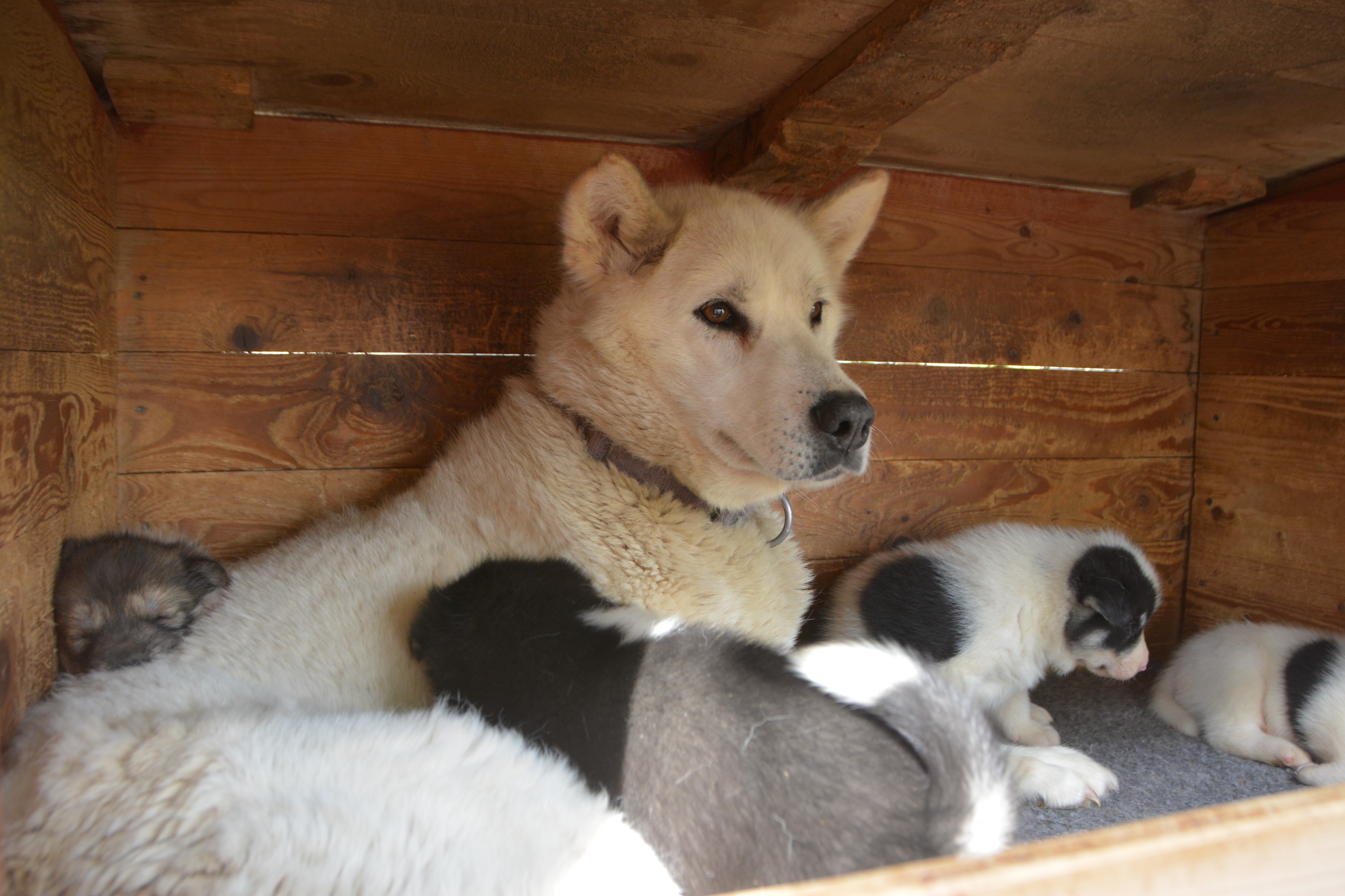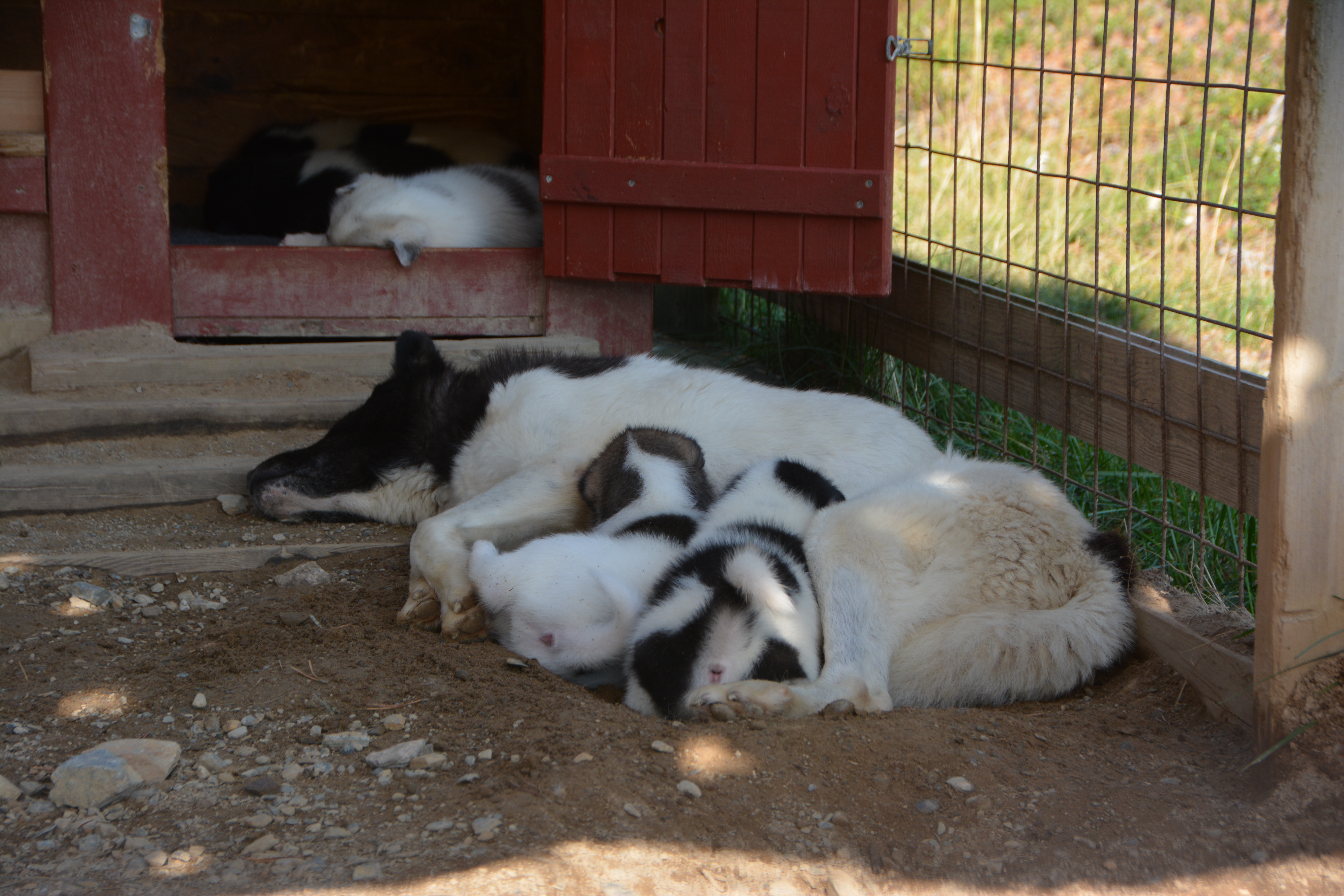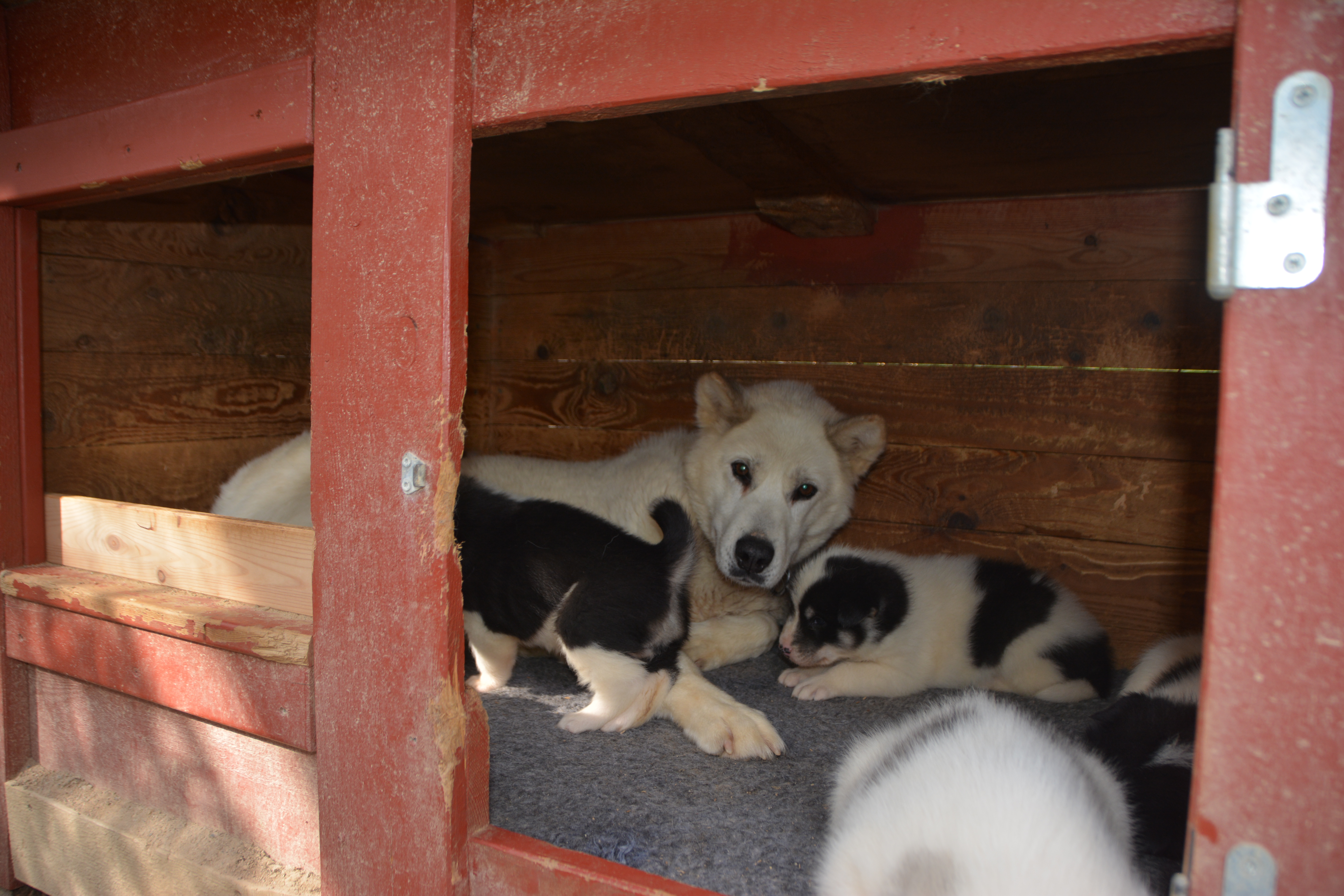 Anori som er valpenes bestemor og hennes kullbror flokklederen Branoq, fikk æren i dag. De er begge ti år gamle, trygge og gode med valper, det er forresten alle de voksne hundene i flokken, men alle kan ikke være først.
