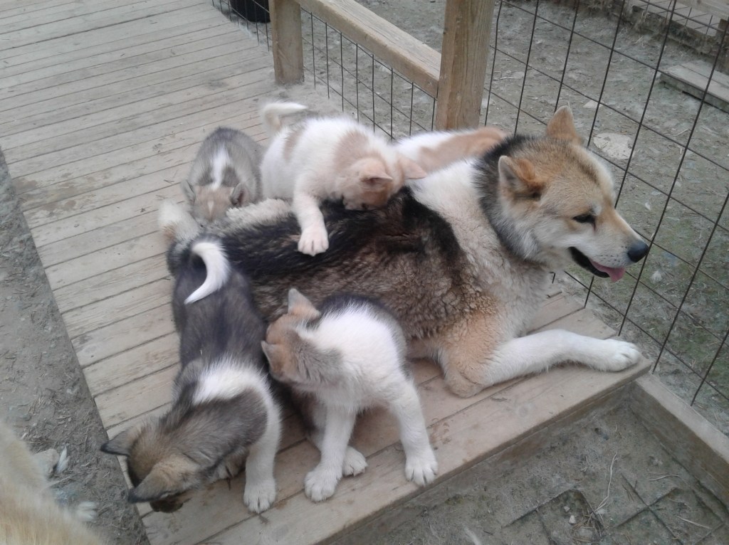 Valpene kastet seg over maten, og fikk umiddelbart selskap av de andre tre valpene og like etter av Skog, Anori og en litt forfjamset Branoq også. Det ble et veritabelt etegilde på Branoqs halvfordøyde oppkast. Kvalmt når en tenker over detaljene, men mest interessant og spennende om en ikke gjør det. Det er jo som hentet ut av rasens opprinnelse der hundenes urgamle instinkter og ikke menneskene, sørget for at valpene fikk mat nok til å overleve.